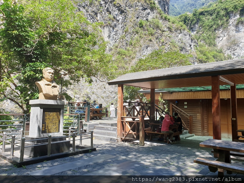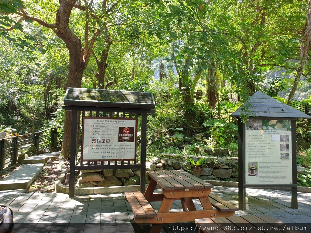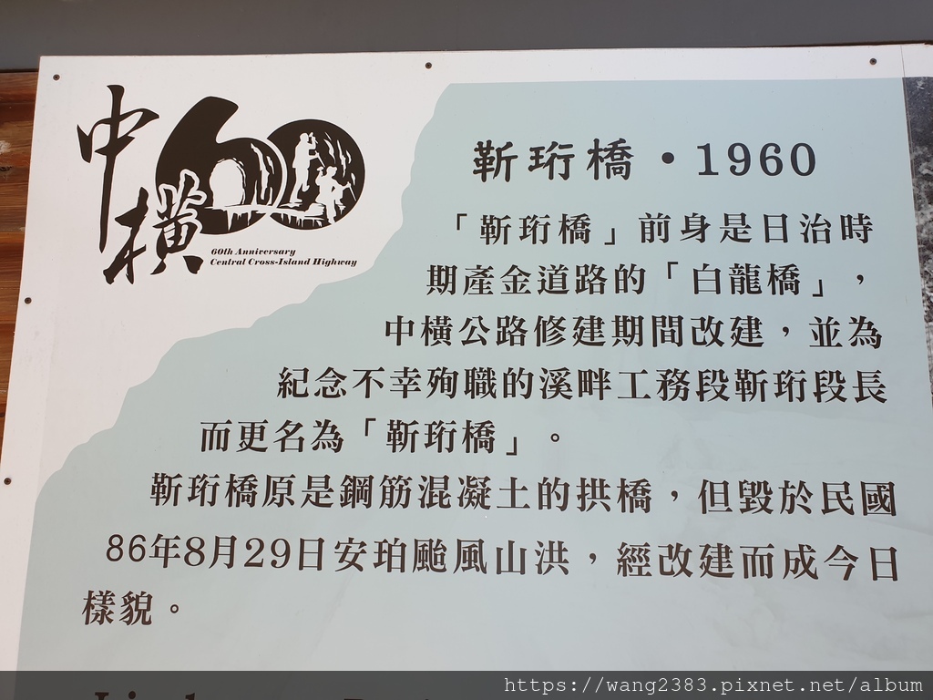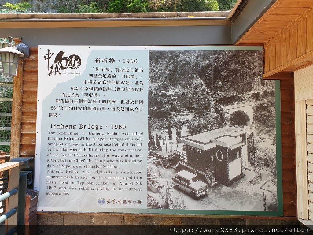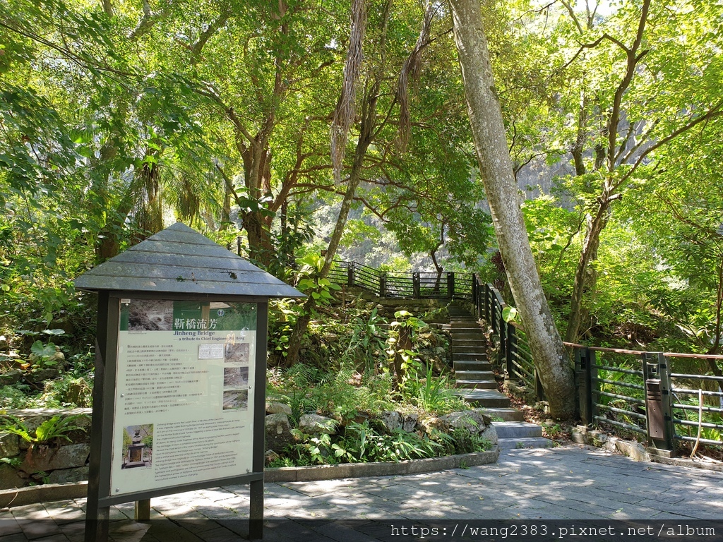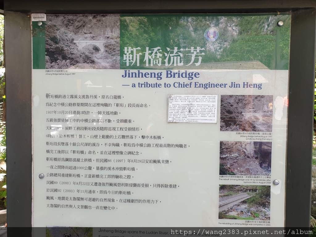 靳珩橋原是圓孔水泥橋,造型相當優美,可惜於民國86年8月29日安珀颱風來襲,山洪爆發將靳珩橋沖毀。靳珩公園為魯丹溪及立霧溪交會處的高地,最高點上立有一尖柱狀之公路局合流工程處殉職員工紀念碑,以茲紀念中橫公路施工期間合流工程處殉職員工。近處有數棵巨大的茄苳樹,樹姿優美,值得欣賞。