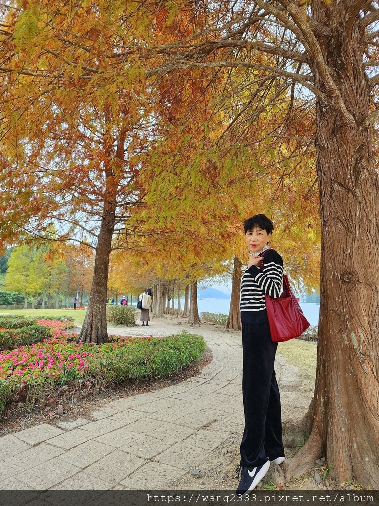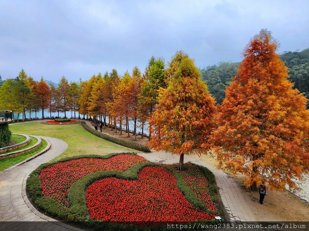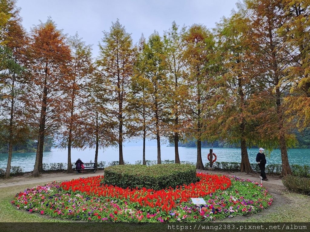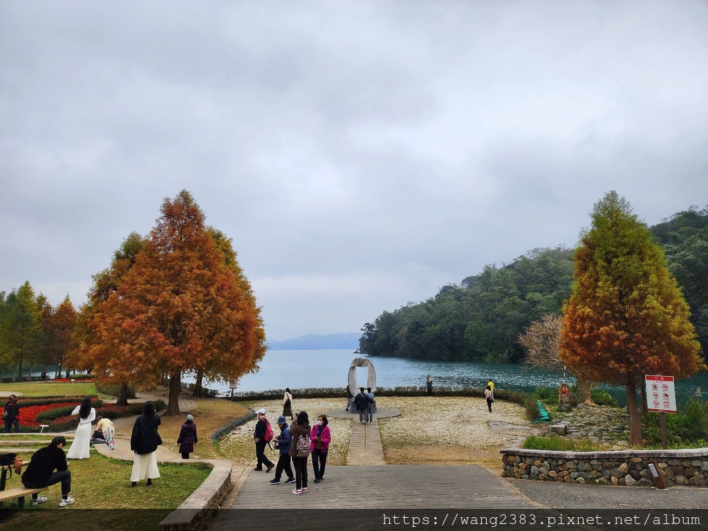 日月潭向山遊客中心是一個建築很有特色的地方,在這裡可以遠眺涵碧半島風景很美。每年的12月中到1月中旁邊的向山落羽松轉黃紅,搭配日月潭水很漂亮,我們是2024年12月19日和20日連兩天來此,落羽松雖未全紅,但已經很漂亮。