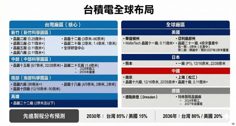 整體而言,台積電目前的全球製造體系呈現出「多元化但非對稱」的結構。海外晶圓廠的設立,主要是回應供應鏈韌性、地緣政治考量與區域客戶需求;而攸關技術研發與先進製程的核心能力,則刻意高度集中於台灣,使台灣成為名副其實的技術與產能核心。先進製程分布預測圖。(取自貼文)