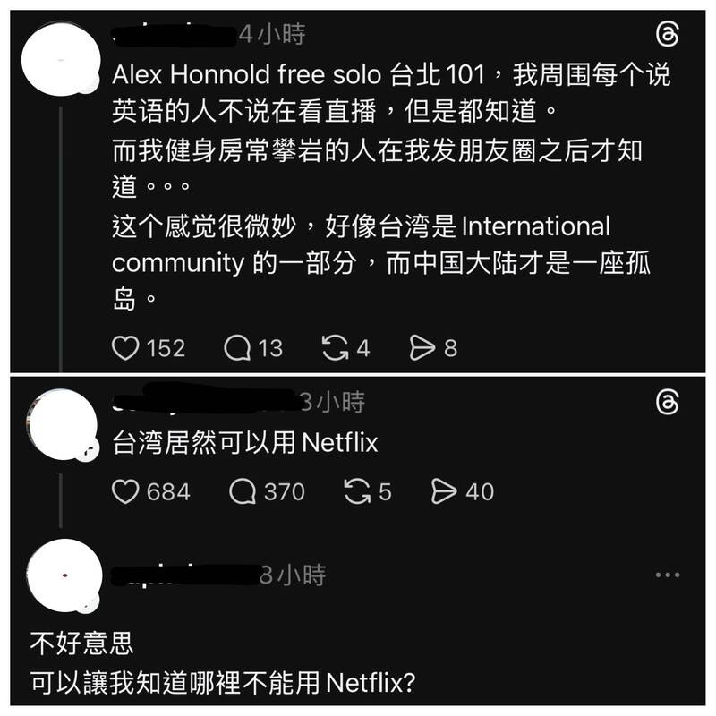 面對美國攀岩好手霍諾德徒手登上台北101,部分中國網友的第一反應是:「台灣居然可以用Netflix」。(取自Threads)