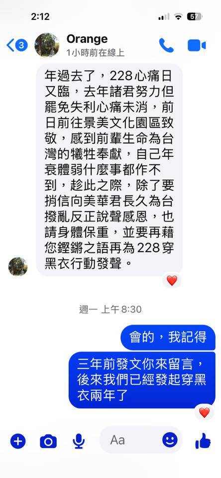三年前,2023年的228,我發文之後,粉絲@orange來留言,說他每年的228,都會自己穿黑衣來記憶這個日子;我立刻留言回覆他,穿上黑衣是非常容易執行的紀念方式,當天發起已來不及,我們明年就開始吧。我發文之後,粉絲@orange來留言,說他每年的228,都會自己穿黑衣來記憶這個日子;我立刻留言回覆他,穿上黑衣是非常容易執行的紀念方式,當天發起已來不及,我們明年就開始吧。(取自許美華臉書)