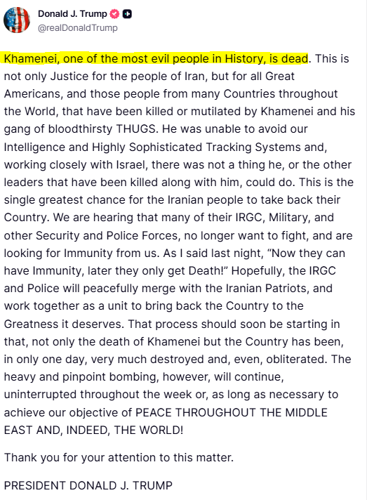 然而,就在俄中兩國在安理會緊急會議上空口白話的打嘴砲時,川普就已在社交平台Truth Social上發布:伊朗神權領袖哈米尼已經被炸死的消息。簡直是直接打臉俄羅斯、中國和聯合國。